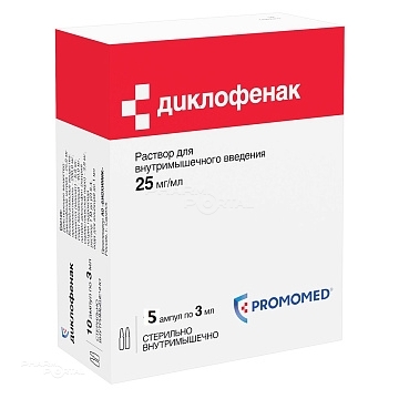 После в/м введения диклофенака в дозе 75 мг его всасывание начинается немедленно. Сmax в плазме составляет в среднем около 2.5 мкг/мл (8 мкмоль/л) и достигается примерно через 20 мин. Количество всасывающегося активного вещества находится в линейной зависимости от величины введенной дозы. AUC после в/м введения диклофенака примерно в 2 раза больше, чем после его перорального или ректального применения, поскольку в последних случаях около половины количества диклофенака метаболизируется при "первом прохождении" через печень. При последующих введениях фармакокинетические показатели не изменяются. При условии соблюдения рекомендуемых интервалов между введениями диклофенака кумуляции не отмечается. Связывание с белками плазмы - 99.7%, преимущественно с альбумином (99.4%). Кажущийся Vd составляет 0.12-0.17 л/кг. Диклофенак проникает в синовиальную жидкость, где его Сmax достигается на 2-4 ч позже, чем в плазме крови. Кажущийся T1/2 из синовиальной жидкости составляет 3-6 ч. Через 2 ч после достижения Сmax в плазме крови концентрация диклофенака в синовиальной жидкости выше, чем в плазме крови, и ее значения остаются более высокими на протяжении периода времени до 12 часов. Диклофенак был обнаружен в низких концентрациях (100 нг/мл) в грудном молоке одной из кормящих матерей. Предполагаемое количество препарата, попадающего через грудное молоко в организм ребенка эквивалентно 0.03 мг/кг/сут.