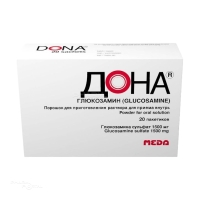 Дона® – обладает противовоспалительным и обезболивающим действием, восполняет эндогенный дефицит глюкозамина, стимулирует синтез протеогликанов и гиалуроновой кислоты синовиальной жидкости; увеличивает проницаемость суставной капсулы, восстанавливает ферментативные процессы в клетках синовиальной мембраны и суставного хряща. Способствует фиксации серы в процессе синтеза хондроитинсерной кислоты, облегчает нормальное отложение кальция в костной ткани, тормозит развитие дегенеративных процессов в суставах, восстанавливает их функцию, уменьшая суставные боли.