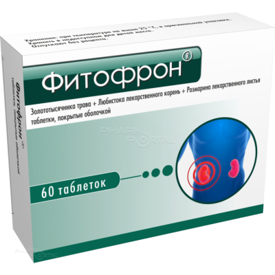 Активный компонент: Фитофрон®, сбор-порошок из лекарственного растительного сырья: золототысячника травы, любистока лекарственного корней, розмарина лекарственного листьев (1:1:1), с содержанием суммы полифенолов в пересчете на пирогаллол не менее 0,74 % - 54,00 мг.
