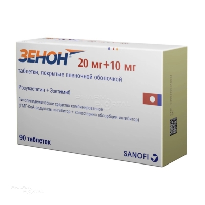 ХС поступает в плазму крови в результате всасывания в кишечнике и эндогенного синтеза. Препарат Зенон® содержит эзетимиб и розувастатин, два гиполипидемических компонента, дополняющих друг друга по механизму действия. Комбинация розувастатин + эзетимиб снижает повышенную концентрацию общего холестерина (ОХС) в плазме крови, холестерина липопротеинов низкой плотности (ХС-ЛПНП), аполипопротеина В (АпоВ), триглицеридов (ТГ) и холестерина липопротеинов невысокой плотности (ХС-не-ЛПВП, рассчитывается как разность между концентрацией ОХС и концентрацией ХС-ЛПВП) и повышает концентрацию в плазме крови холестерина липопротеинов высокой плотности (ХС-ЛПВП) путем двойного ингибирования, как абсорбции, так и синтеза ХС.
