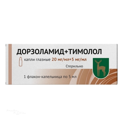 При местном применении дорзоламид проникает в системный кровоток. При длительном применении дорзоламид накапливается в эритроцитах в результате селективного связывания с карбоангидразой II типа, поддерживая чрезвычайно низкие концентрации свободного препарата в плазме. В результате метаболизма дорзоламида образуется единственный N-дезэтильный метаболит, который менее выраженно блокирует карбоангидразу II типа по сравнению с начальной его формой, однако в то же время ингибирует карбоангидразу I типа – менее активный изоэнзим. Метаболит также накапливается в эритроцитах, где связывается главным образом с карбоангидразой I типа. Около 33 % дорзоламида связывается с белками плазмы крови. Дорзоламид выводится с мочой в неизменном виде и в виде метаболита. После прекращения применения препарата дорзоламид нелинейно вымывается из эритроцитов, что сначала приводит к быстрому снижению его концентрации, а затем элиминация замедляется. Т1/2 составляет около 4 месяцев.
