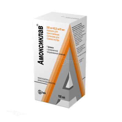 Порошок для приготовления суспензии для приема внутрь, 125 мг + 31,25 мг/5 мл, 250 мг + 62,5 мг/5мл, 400 мг + 57 мг/5 мл.