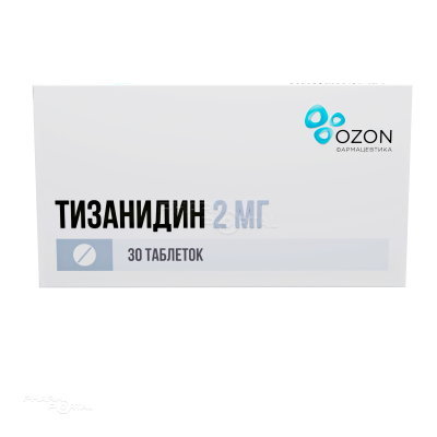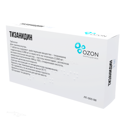 Действующее вещество: тизанидина гидрохлорид - 2,288 мг, в пересчете на тизанидин - 2 ,000 мг.