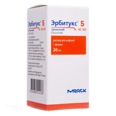 Препарат Эрбитукс® содержит действующее вещество цетуксимаб, которое относится к группе лекарственных средств "противоопухолевое средство, антитела моноклональные". Моноклональные антитела представляют собой белки, которые специфически распознают и связываются с другими уникальными белками, называемыми антигенами. Цетуксимаб связывается с рецептором эпидермального фактора роста (EGFR), антигеном на поверхности некоторых раковых клеток. EGFR активирует гены, называемые RAS. RAS играет важную роль в передаче сигнала от EGFR (сложном сигнальном каскаде), который участвует в развитии и прогрессировании рака. В результате этого связывания раковая клетка больше не может получать сообщения, необходимые ей для роста, прогрессирования и метастазирования.