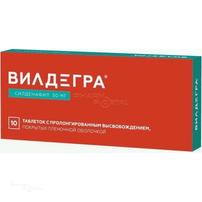 После однократного приема препарата Вилдегра® в дозе 100 мг средняя максимальная концентрации (Cmax) силденафила в плазме крови мужчин составляет около 411 нг/мл. Cmax силденафила при приеме препарата Вилдегра® внутрь натощак достигается в среднем в течение 2 ч.