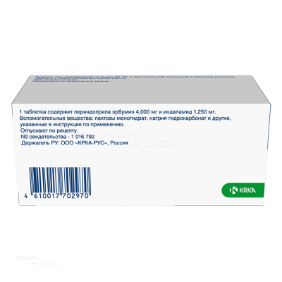 Действующие вещества: индапамид 0,625 мг/1,250 мг/2,500 мг, периндоприла эрбумин 2,000 мг/4,000 мг/8,000 мг