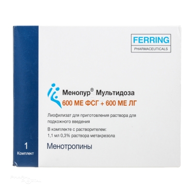 МЕНОПУР МУЛЬТИДОЗА 600МЕ ФСГ+600МЕ ЛГ N1 лиоф д/пригот р-ра п/к введ в комплекте: игла для приготовления раствора, растворитель (шприц) 1 мл, шприц с иглой (9) ФЕРРИНГ АРЗНЕЙМИТТЕЛ в Москве