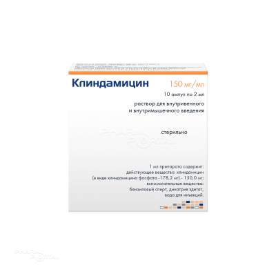 1 мл препарата содержит: действующее вещество: клиндамицин 150,0 мг (в виде клиндамицина фосфата – 178,2 мг); вспомогательные вещества: бензиловый спирт, динатрия эдетат, вода для инъекций.