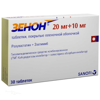 ХС поступает в плазму крови в результате всасывания в кишечнике и эндогенного синтеза. Препарат Зенон® содержит эзетимиб и розувастатин, два гиполипидемических компонента, дополняющих друг друга по механизму действия. Комбинация розувастатин + эзетимиб снижает повышенную концентрацию общего холестерина (ОХС) в плазме крови, холестерина липопротеинов низкой плотности (ХС-ЛПНП), аполипопротеина В (АпоВ), триглицеридов (ТГ) и холестерина липопротеинов невысокой плотности (ХС-не-ЛПВП, рассчитывается как разность между концентрацией ОХС и концентрацией ХС-ЛПВП) и повышает концентрацию в плазме крови холестерина липопротеинов высокой плотности (ХС-ЛПВП) путем двойного ингибирования, как абсорбции, так и синтеза ХС.