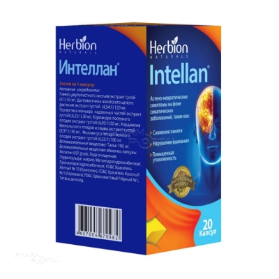 Интеллан является сбалансированным препаратом из растительных экстрактов, богатых биоактивными алкалоидами, флавоноиды, сапонинами, гликозидами, аминокислотами, витаминами и необходимыми микроэлементами. Препарат усиливает функцию памяти, умственную деятельность, активирует нейротрансмиттерные центры, подавляет беспокойство и депрессию.