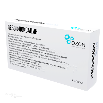 Действующее вещество: левофлоксацина гемигидрат - 512,46 мг в пересчете на левофлоксацин - 500,00 мг.