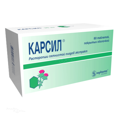 Карсил® принадлежит к группе гепатопротекторных лекарственных средств. Содержит сухой экстракт плодов расторопши пятнистой (эквивалент силимарина), который является смесью 4 изомеров флаволигнанов: силибинина, изосилибинина, силидианина и силикристина. Механизм действия препарата все еще недостаточно изучен. Установлено, что гепатопротекторное действие силимарина обусловлено конкурентным взаимодействием с токсинами на соответствующие рецепторы в мембране гепатоцитов, проявляя, таким образом, мембраностабилизирующее действие. Силимарин оказывает метаболические и клеточно-регулирующие эффекты, регулируя проницаемость клеточной мембраны, подавляя 5-липоксигеназный путь, в особенности лейкотриена В4 (LТВ4), а также связываясь со свободными реактивными кислородными радикалами. Стимулирует синтез протеинов (структурных и функциональных) и фосфолипидов в пораженных гепатоцитах, ускоряя регенеративные процессы. Действие флавоноидов, к которым принадлежит силимарин, также обусловлено их антиоксидантными и улучшающими микроциркуляцию эффектами. Клинически эти эффекты выражаются в улучшении субъективной и объективной симптоматики и в нормализации показателей функционального состояния печени (трансаминазы, гамма-глобулин, билирубин). Это ведет к улучшению общего состояния, уменьшению жалоб, связанных с пищеварением, а у пациентов с пониженным усвоением пищи вследствие заболевания печени, ведет к повышению аппетита и увеличению массы тела.